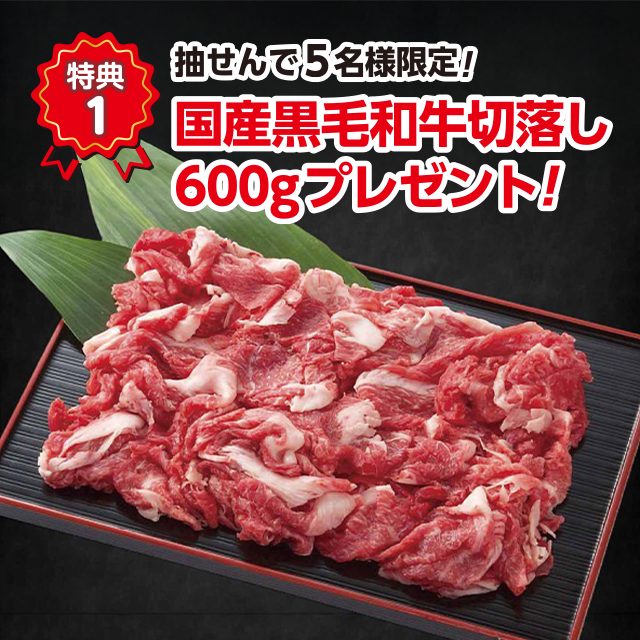 - ●抽選で5名様に「黒毛和牛切落し600g」が当たる!※1