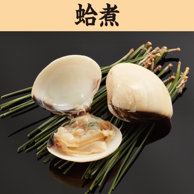 蛤煮、わかめ、赤魚西京焼、松麩、渋皮栗甘露煮、きんとん、黒豆甘露煮、味付いくら、紅白なます、バイ貝旨煮、きぬさや、蒲鉾 紅、蒲鉾 白、味付数の子、松前漬
